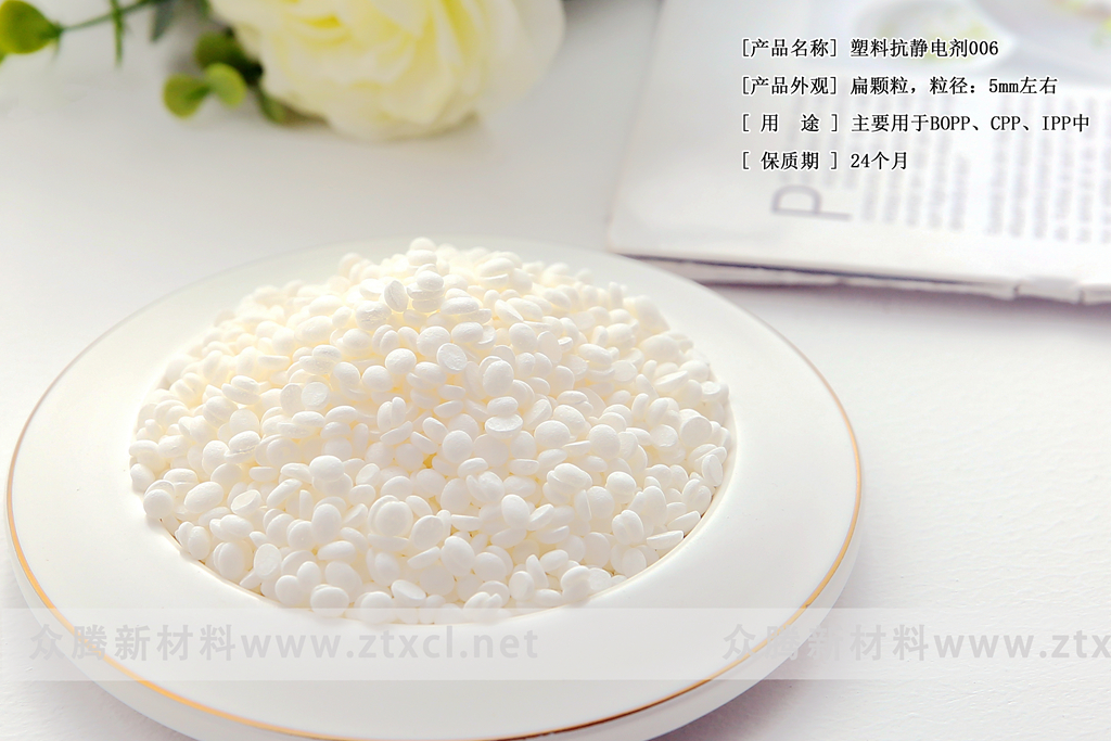 單硬脂酸甘油酯與硬脂基乙氧酰胺的復(fù)配物。006 是由脂肪酸酯及乙氧基酰胺復(fù)配而成,與傳統(tǒng)的脂肪酸酯與及脂肪胺復(fù)配相比,具有耐熱性更好,抗靜電劑性能更優(yōu)異的特點。
